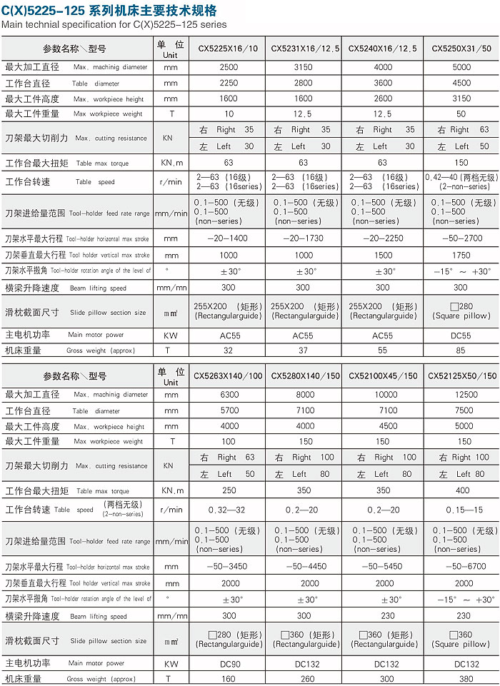 C (X) 5225-125 series of ordinary (digital) double column vertical lathe ● Introduction to machine tools The series of machine tools for high-speed steel, carbide cutting tools and ceramic tools for ferrous metals, non-ferrous metals and some non-metallic parts of the rough, finishing. Worktable constant current hydrostatic system for synchronous motor oil separator. So that the hydraulic system work more stable and reliable. The electrical control for the PLc program controller controls the reduction of the control element. Reduce the failure rate. So that the machine moves more accurate and reliable. ● Machine basic parts By the base, the table. Around the column, beams, connecting beams, gantry and other components, material for the HT250-300 quality alloy wear-resistant cast iron. The vibration aging of a hot furnace aging a vibration aging a roughing a vibration aging half of a finishing furnace a time of vibration aging finishing a work to eliminate the workpiece stress to ensure long-term operation accuracy of the machine. ● Spindle bearings The use of high-precision double-row short cylindrical roller bearings, bed rail for the super-audio quenching processing, table and bed rail for the constant current hydrostatic guide, constant temperature cooling, to ensure that the machine has a high rotation accuracy and sufficient rigidity, Thermal stability. ● Column Using the gantry frame closed structure, through the finite element analysis and calculation, the structure size and force state to achieve the best. ● Vertical turret Horizontal rails for sliding or static pressure unloading rails, vertical movement using sliding rails. ● X, Z and U, W axis feed system ≤ 4m for the AC motor drive trapezoidal screw separation drive mechanism,> 4m for the AC servo motor drive ball screw separation drive mechanism. According to the user need to select a single knife or double knife. ● Machine main drive Driven by the DC motor, the two-speed mechanical transmission mechanism, to achieve the speed range of the table. |